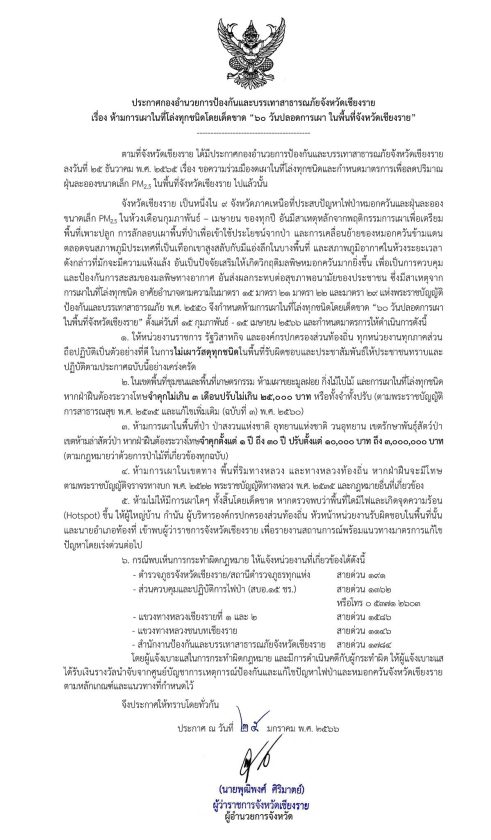 ประกาศกองอำนวยการป้องกันและบรรเทาสาธารณภัยจังหวัดเชียงราย เรื่อง ห้ามการเผาในที่โล่งโดยเด็ดขาด 7 มีนาคม 2024ณัฐพงษ์ สิทธิอักษรประชาสัมพันธ์ FacebookFacebookXXLINELine
